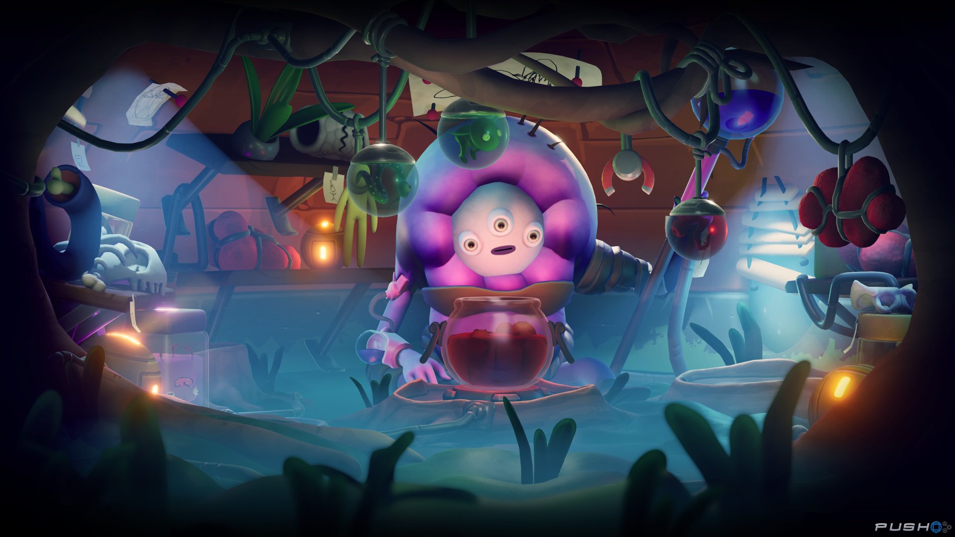 Jij kijkt als zogenaamde Chairopian toe vanuit je zetel en controleert Trover vanop afstand. Je controller is daarbij prominent in beeld, een beetje vergelijkbaar met de VR-game Astro Bot. Dit is eveneens een VR-game, als je dat wilt tenminste. Spelen zonder headset kan ook, maar dat is niet onze favoriete manier om dit doldwaas avontuur te beleven. En aan alles merk je dat ontwikkelaar Squanch Games de game ontworpen heeft las VR-ervaring.