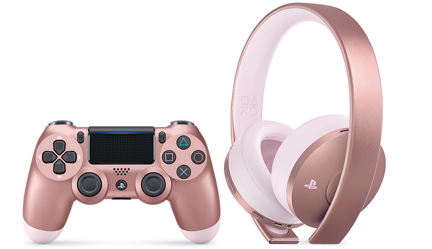 De DualShock 4 wordt gelanceerd in Electric Purple, Red Camouflage, Titanium Blue en Rose Gold. Die laatste versie wordt nog eens extra in de verf gezet, want de PlayStation Wireless Headset krijgt ook een bijpassende Rose Gold uitvoering.